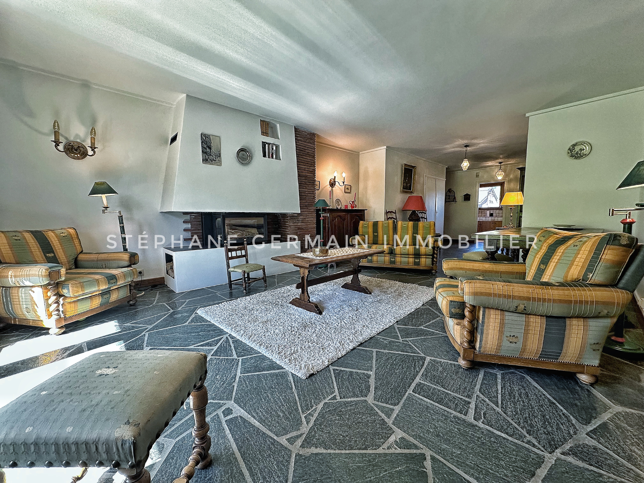 Une entrée, WC invités, un séjour/salon avec une cheminée donnant sur un balcon, une cuisine indépendante, 3 chambres, une salle de bains avec WC, et une autre salle de bains,