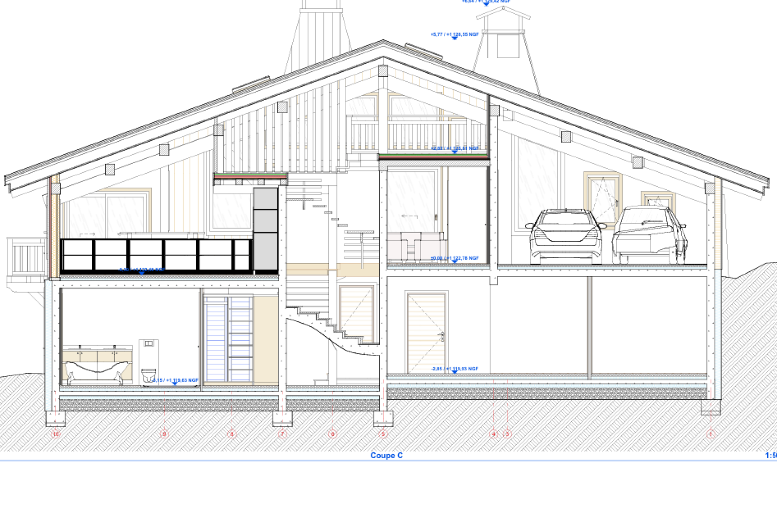 En rez de chaussée : une entrée, un wc invités, une cuisine américaine, une salle à manger donnant sur une terrasse , un salon cathédral avec cheminée donnant sur terrasse et balcon, un garage double de 41 m² pour 2 voitures.